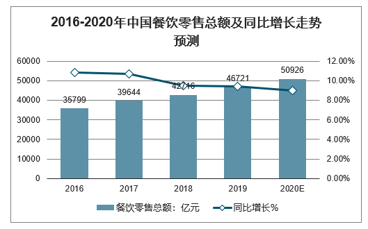 反观餐饮业本身,这是一个市场前景广阔的行业。国家统计局数据显示,2019年我国餐饮业收入达到46721亿元,比上年增长9.4%。伴随疫情后复工复产有序开展、居民消费进一步释放,预计2020年我国餐饮市场规模将突破5万亿元。